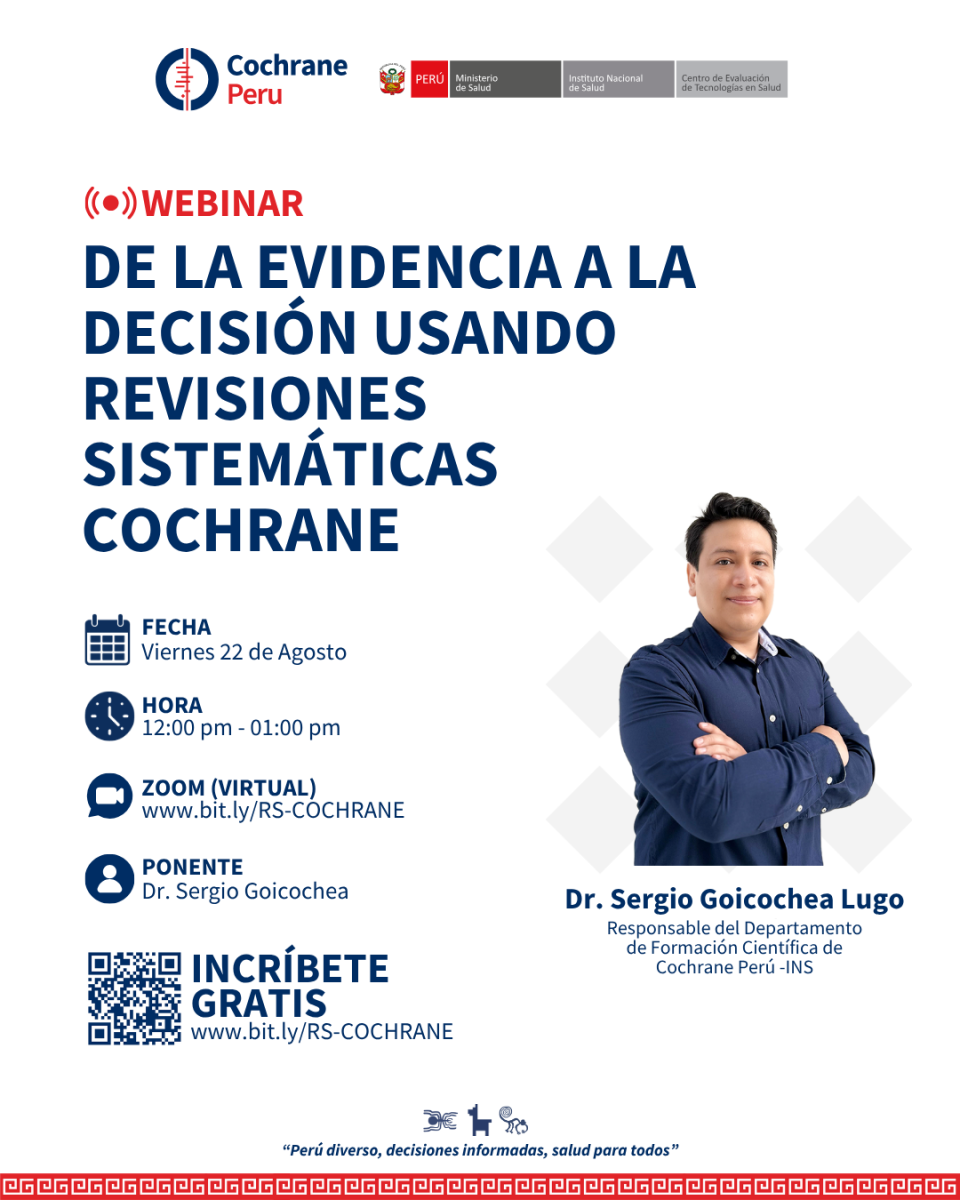 Cochrane Perú del Instituto Nacional de Salud organiza el evento “De la evidencia a la decisión usando revisiones sistemáticas Cochrane”, un espacio de capacitación dirigido a profesionales de la salud, investigadores, tomadores de decisiones y otros actores del sistema de salud interesados en fortalecer el uso de evidencia científica confiable.